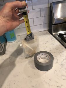 Well, on Friday morning I decided I’d give it one more shot. I had the brilliant idea of putting some duct tape on the end of a tape measure and reaching down there. My first attempt ended with the duct tape getting stuck to the wall and coming off.