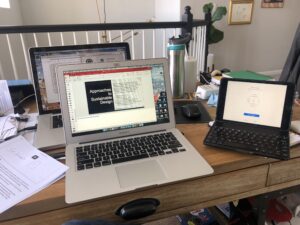 Following that, I started the process of trying to rescue the data from fast spiraling old computer. I got the backup drive hooked up and increasingly struggled to bring the erratic mouse under control, but eventually got the process going. I then tuned into my next meeting, and then got ready to teach the CU class. At one point I had three screens going, which was a bit like staring into madness.