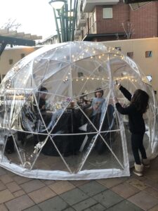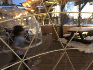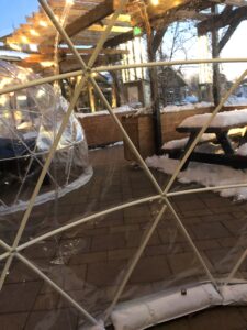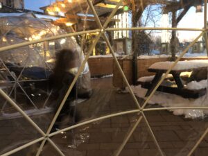 When my meetings were finally finished, I was exhausted, but pleased to have gotten through it all realatively well. And we had something fun to look forward to. We had gotten a reservation at one of those cool igloos at a nearby restaurant Erin and I really like, so the four of us headed out to dinner.