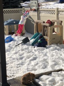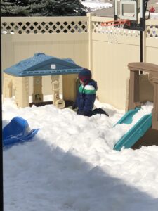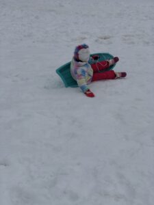 So going way back to Tuesday, it actually wound up being yet another snow day for Amelia as the county continued to dig out from Sunday’s big storm. Henry did have his ABA therapy, but after that was over and we had lunch, Erin had the excellent idea of walking over to a snowy hill in the neighborhood and doing some sledding.