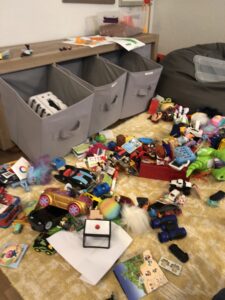 While cleaning up what was a notable mess in the kitchen, Henry kept asking me to play Spongebob with him. I told him I would soon, and while I was doing my thing I heard a lot of racket coming from the play room. I asked what that was and Henry reported he was looking for his Spongebob toys. When I finally had the kitchen close to clean, I went over to look and discovered that Henry had dumped every toy bin on the floor.