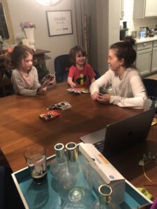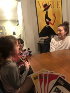 As usual, Amelia was merciless with the Draw Fours, and won the first few rounds. It was also really funny to watch Henry, who on each turn got all contemplative, saying, “OK, it’s a blue 8, and let’s see what I have…Oh, I have a blue 3!”