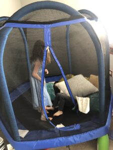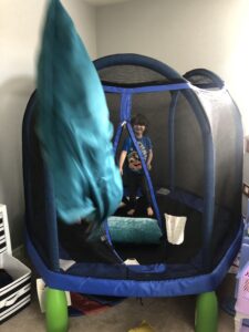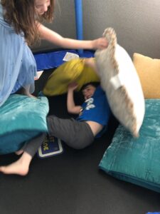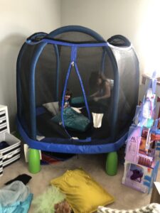 Back home, Erin had some things to do out in the world and I hung out with the kids. Up in the playroom, Henry has really gotten into pillow fights and we sort of invented a new game called Pillow Battle, where in this case they would both be in the trampoline and I would throw pillows over and through the netting to get them. Amelia would deflect one here or there with a karate chop.