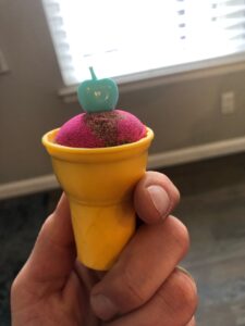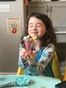 Later in the morning, while Erin and I enjoyed a little breakfast, the kids were playing with Amelia’s play sand, which is sort of a clay type of material with little ice cream shop accessories. Henry made me a rather delicious looking cone. And Amelia whipped up quite a sundae for herself.