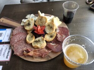 It was a beautiful day downtown, and the place was pretty cool and well operated for the pandemic. Limited occupancy and temperature checks, and instead of wandering around to all the different food stations, you just scanned a QR code from your table that gave you access to all the menus, and you order online and the food is brought to you. Pretty slick and minimal contact. We started out with a lovely cheese and meat plate.