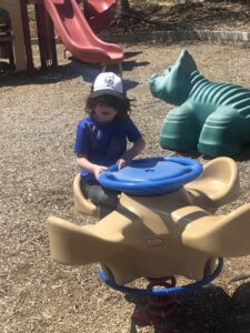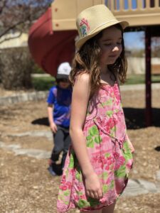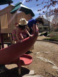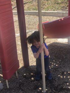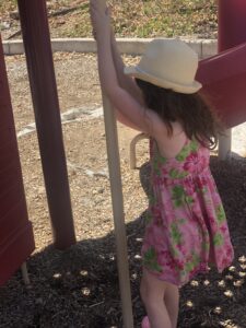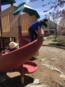 Henry kept wanting to play this little game where he’d climb up the slide, and then have his hat comically fall off. His sister would laugh hysterically, he would say, “Oh, NO!” with great exaggeration, and then they’d go down to get the hat, and do it all again. Captured here is the hat in mid-fall.