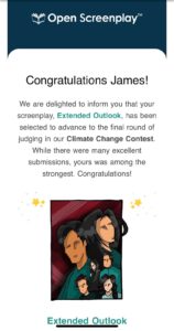 Back to that lazy Sunday morning, I opened my email and saw a note from the group running the screenplay contest. I honestly thought it was over and done, but it turns out judging is still going on and my screenplay has made it to the final round.