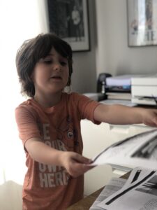 For quite a while, Henry has been really into bringing us printouts from the printer. He loves getting the papers and bringing them to us. And to be honest, it’s a pretty handy service. Only trouble is sometimes he gets a little over-eager and is yanking the page out before it’s finished, which indeed he did here. But the printer must be getting used to him and managed to get through the print job anyway, and Henry delivered the goods.