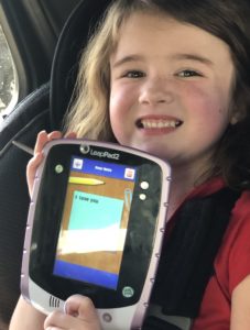 Amelia passed the time in the parking lot working on her little Leap Pad, and kept asking how should text Erin and me. I don’t think many toddler toys from 2014 are set up with 4G access, so there was no real way to accomplish that. She was bummed because she wanted to send this message to her mom and dad, so I told her I’d take a picture and send it that way: